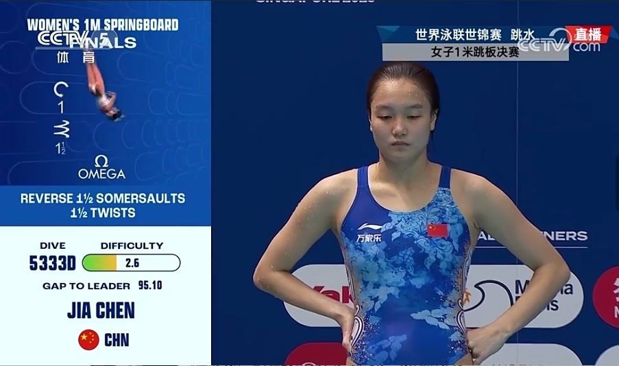 女子单人1米跳板是非奥运项目。在7月26日上午进行的预赛中,陈佳与李亚杰分别排名第二和第三,基尼排名第一。